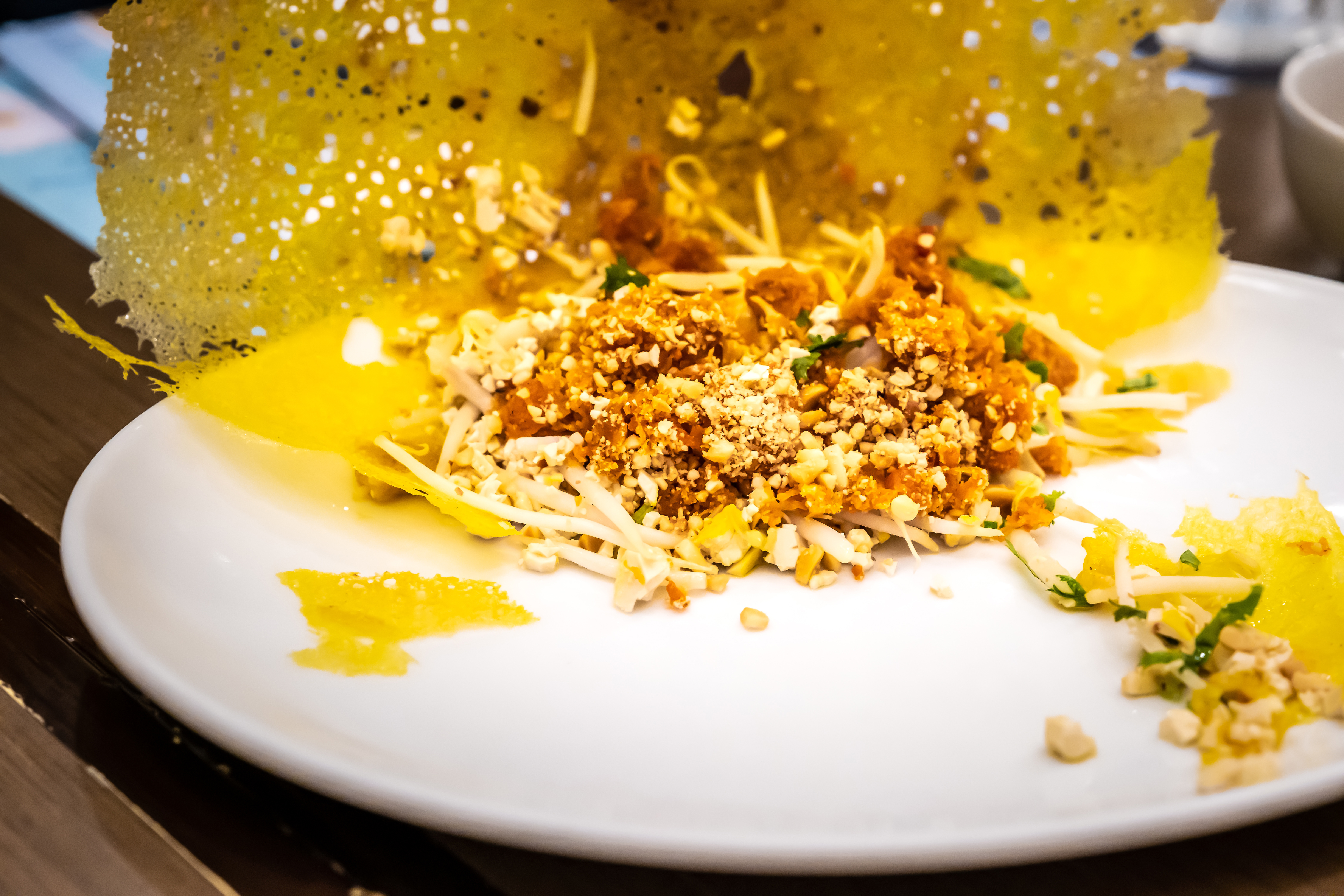 Le bánh xèo est une crêpe faite à base de farine de riz et de curcuma, pliée en deux et garnie avec de la viande de porc, des graines et germes de soja. Il y a une version à la crevettes non décortiquées également. Elle se mange avec des feuilles de moutarde ou des feuilles de salade ainsi que différentes herbes aromatiques, menthe et coriandre. Le tout est trempée dans la traditionnelle sauce nuoc mam. Oui, comme des nems !