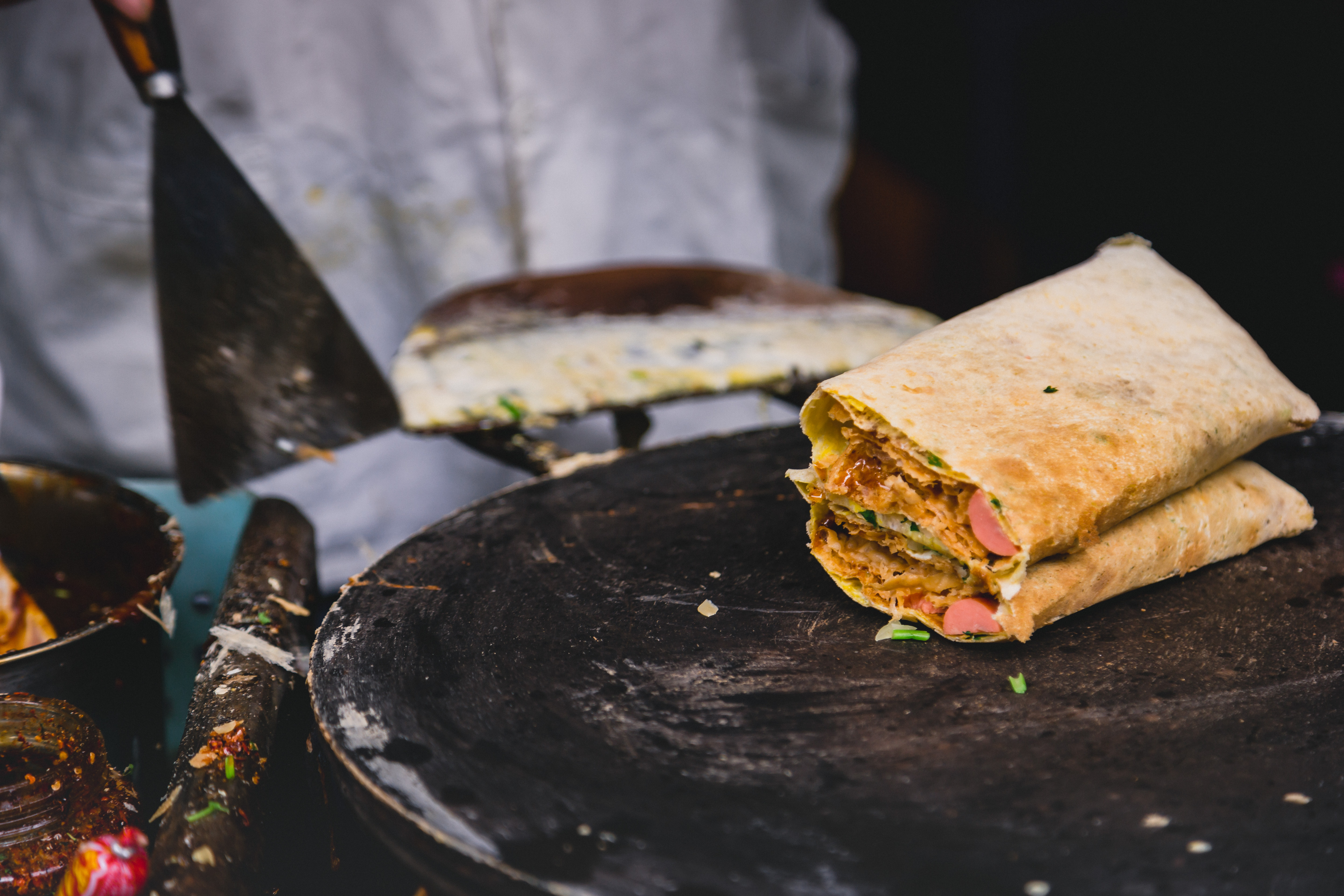 Plus épais car on laisse la pâte lever pendant plusieurs heures, le hotteok est une crêpe fourrée d’un mélange sucré. Globalement, il s’agit d’une cassonade, de miel, de cacahuètes broyées et/ou de cannelle. On raconte que ce sont les marchands Chinois qui ont introduit cette recette au dix-neuvième siècle. Fun fact, en Corée, on dit « le stand de hotteok brûle » pour parler de situations bruyantes.