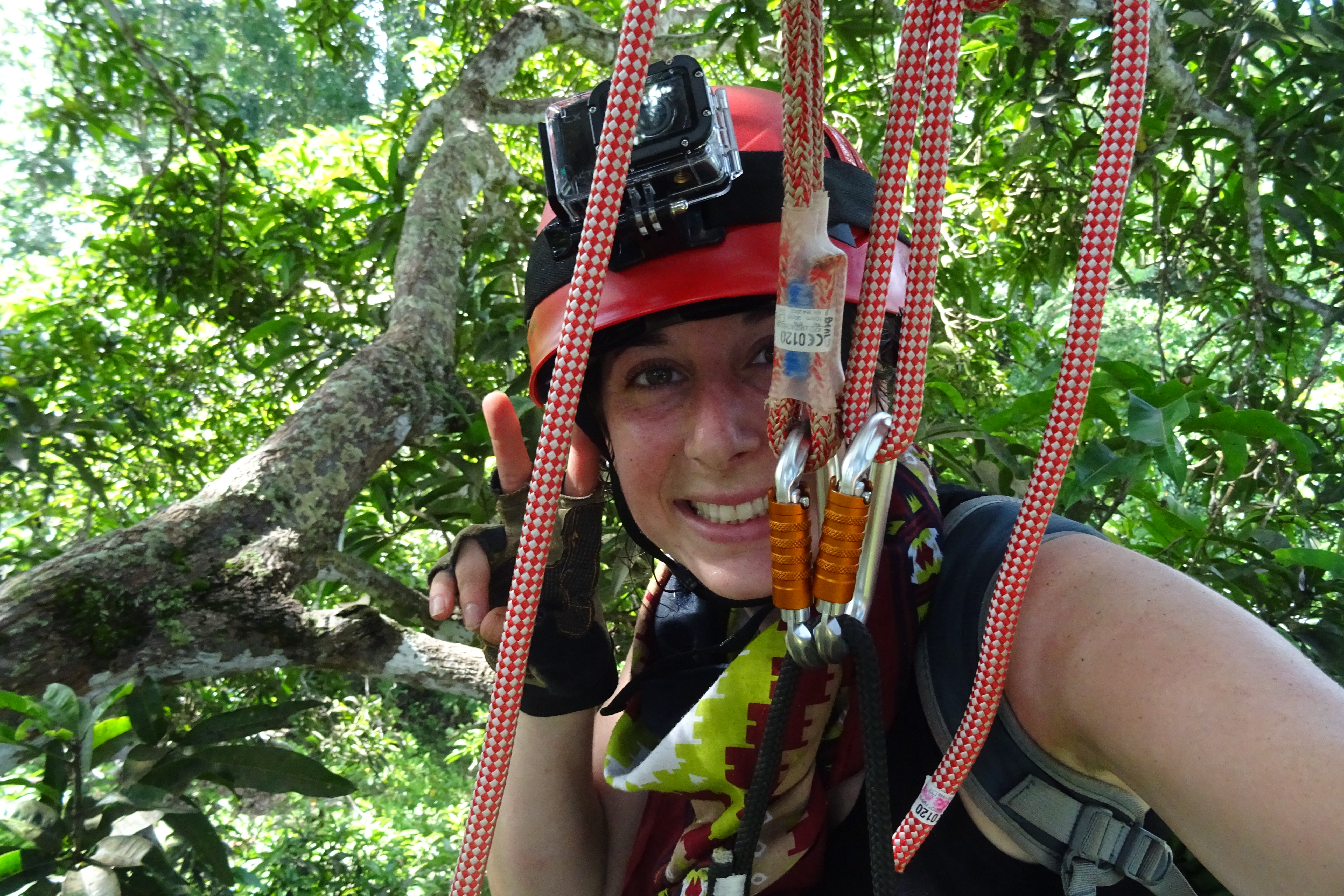 Maintenant que vous en savez plus sur le binturong et l’île, revenons à ce voyage à Palawan, et au contenu de mes bagages. Nous avons besoin de connaitre le binturong pour mieux le protéger. Mais comment faire pour collecter des données sur un animal qui ne descend pratiquement jamais au sol ? Et bien en allant l’observer directement dans la canopée. Fraichement formé à la grimpe d’arbre en France, j’entreprends d’installer des pièges photographiques (appareil photo se déclenchant au mouvement) à 20 mètres de hauteur.